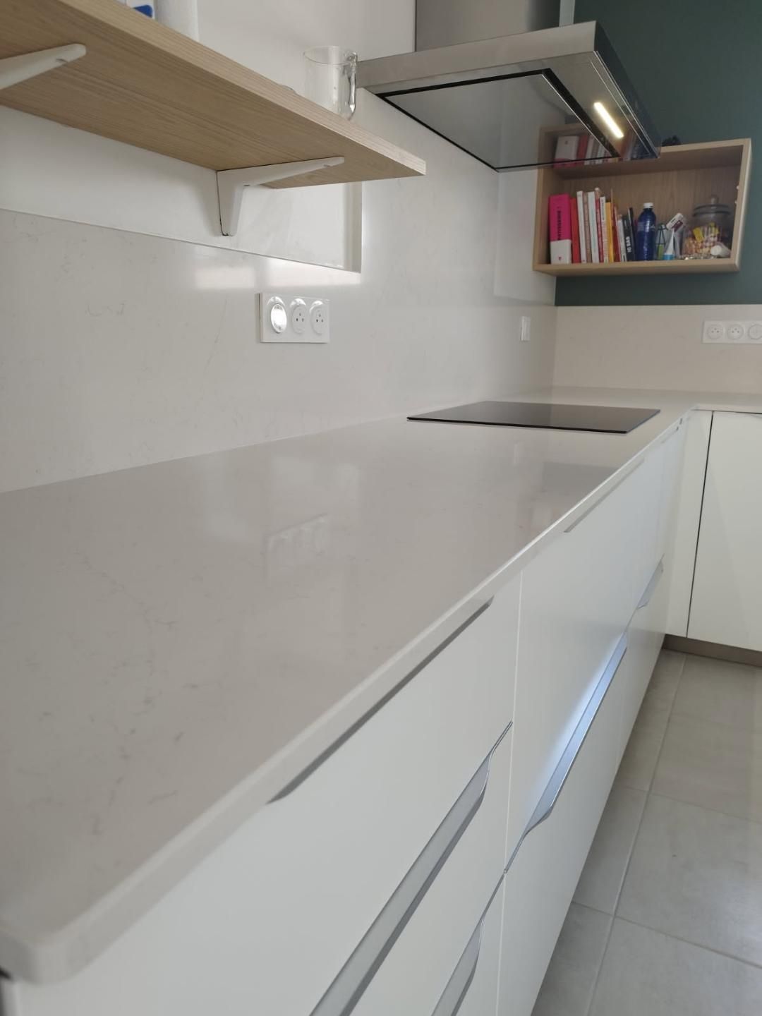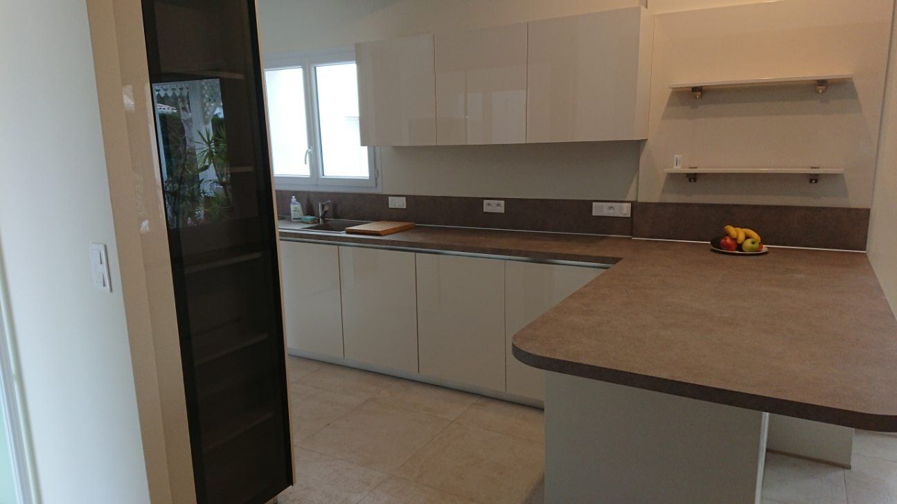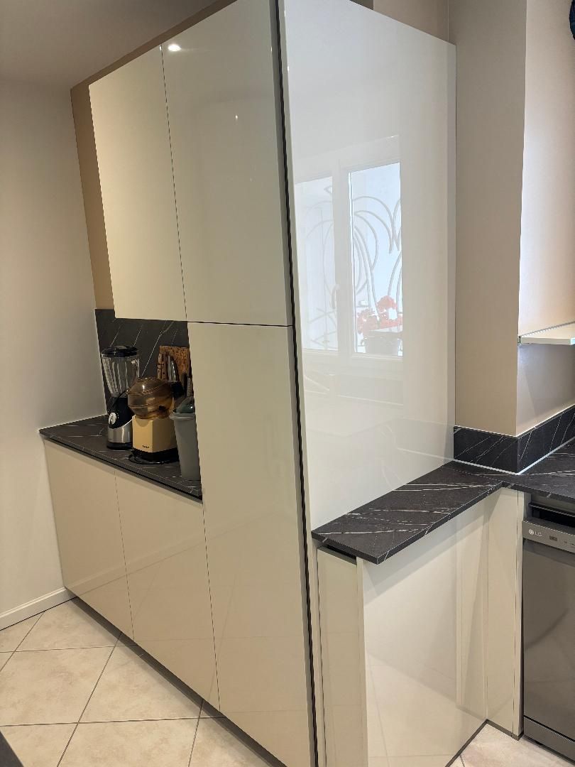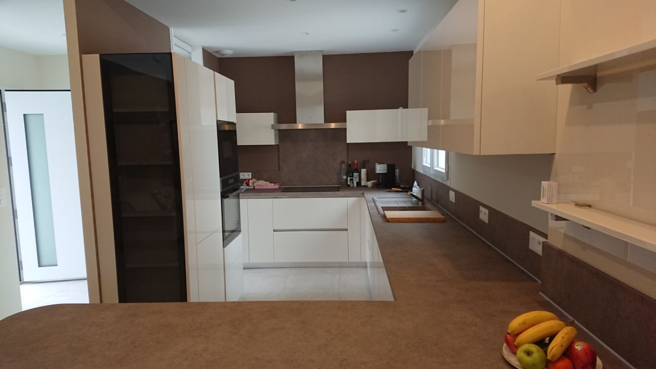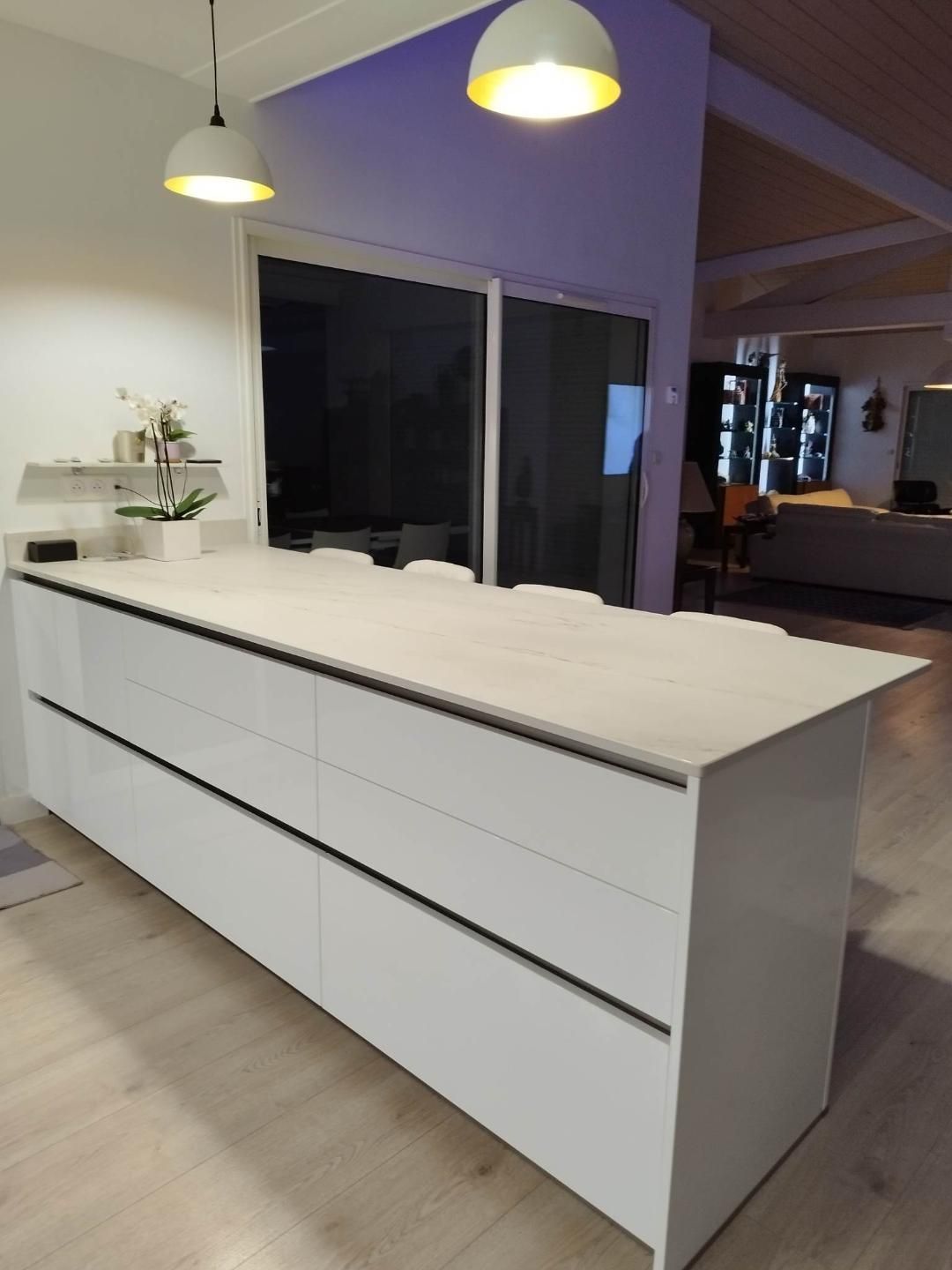 Teinte laqué blanc brillant avec plans et crédences en Dekton REM