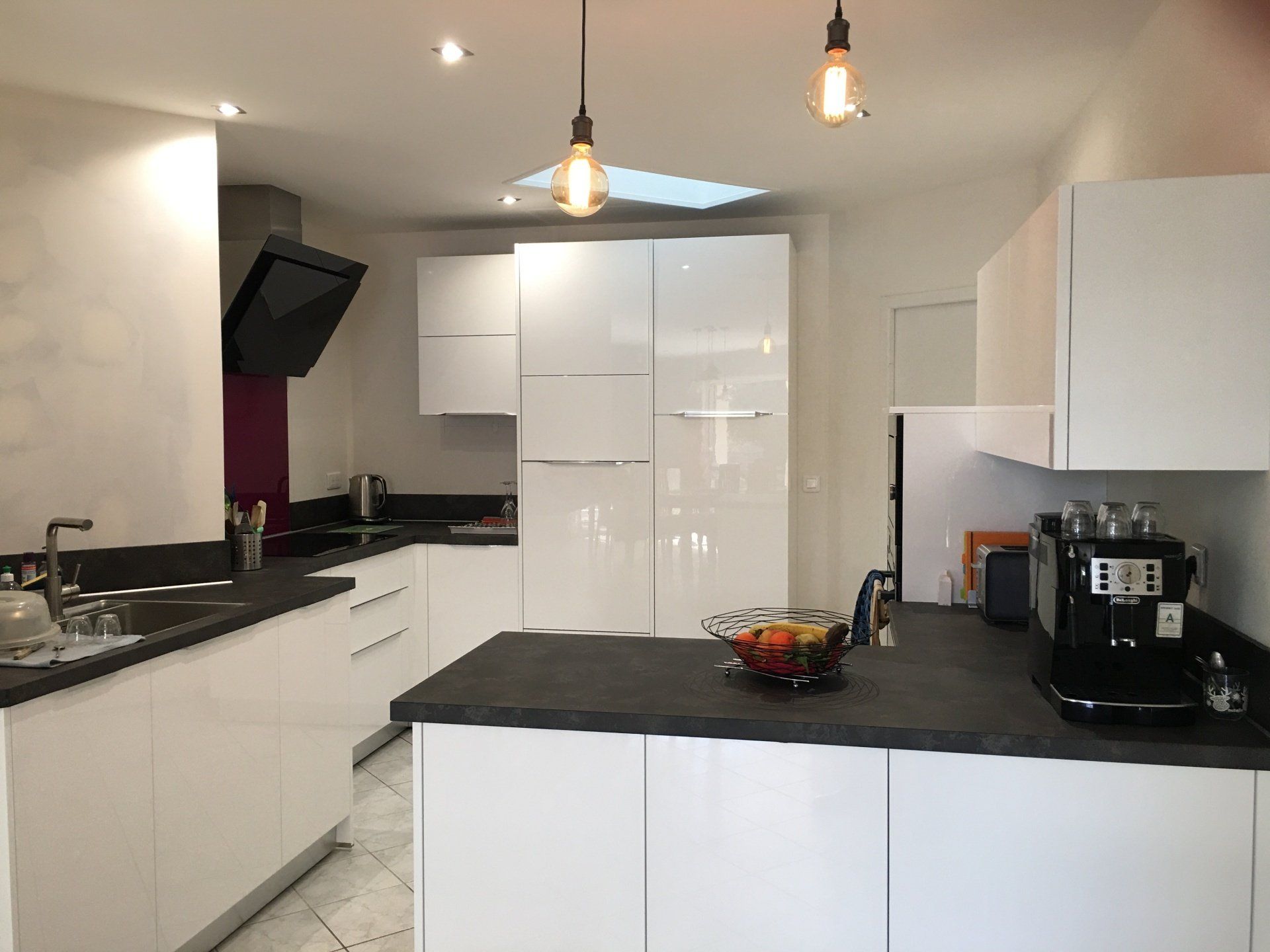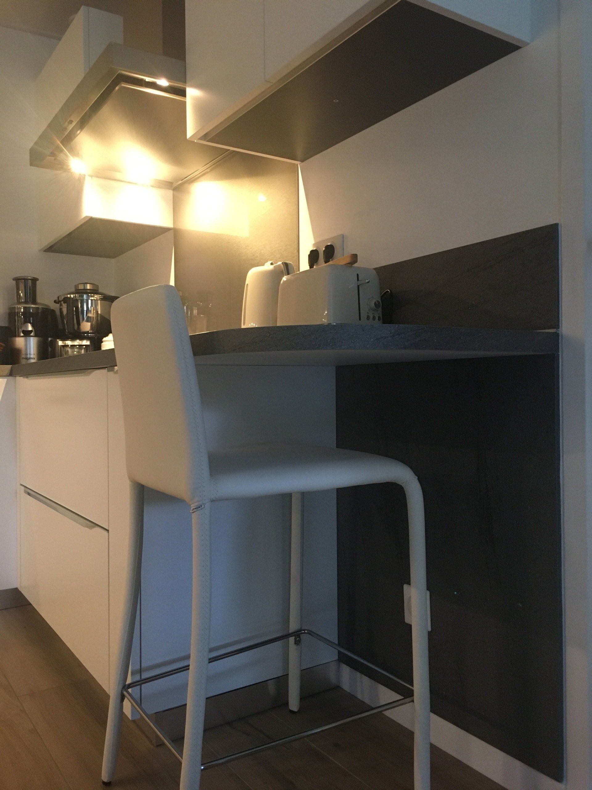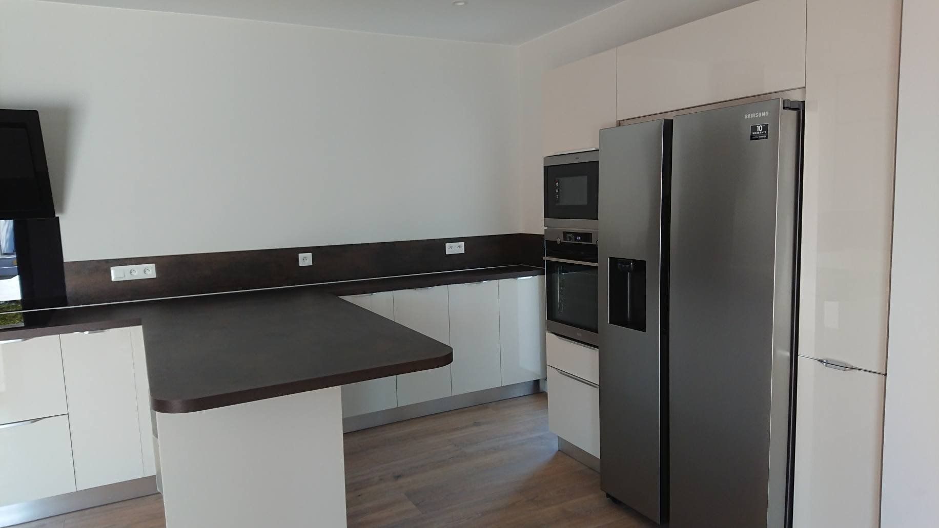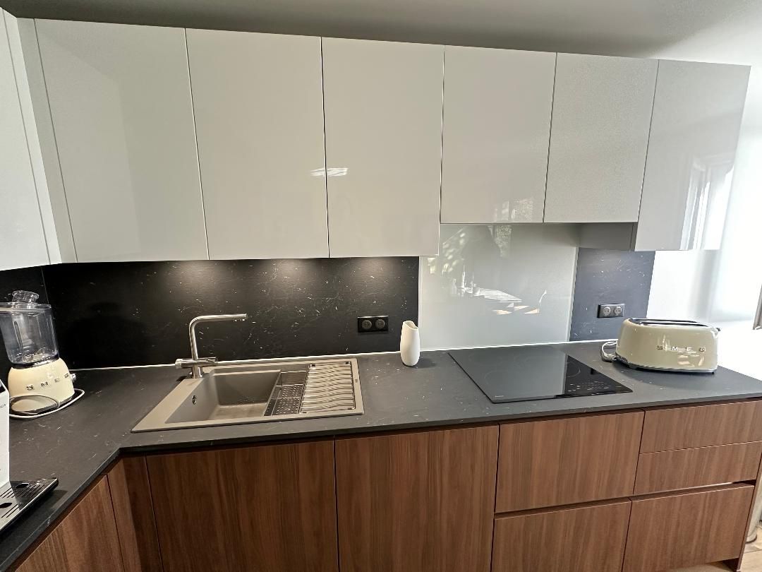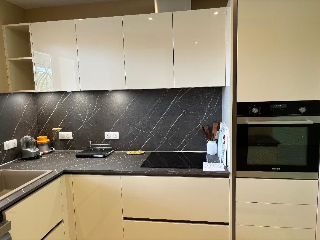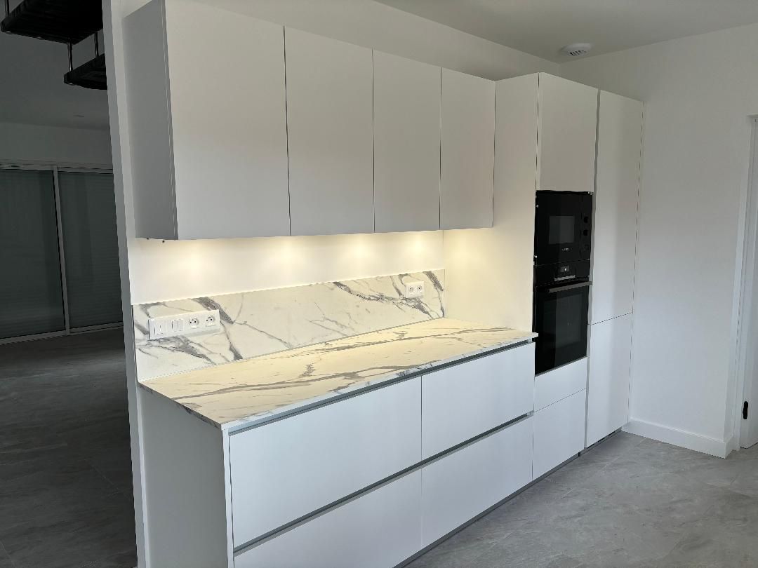 Teinte laqué blanc brillant avec plans et crédences en Dekton REM