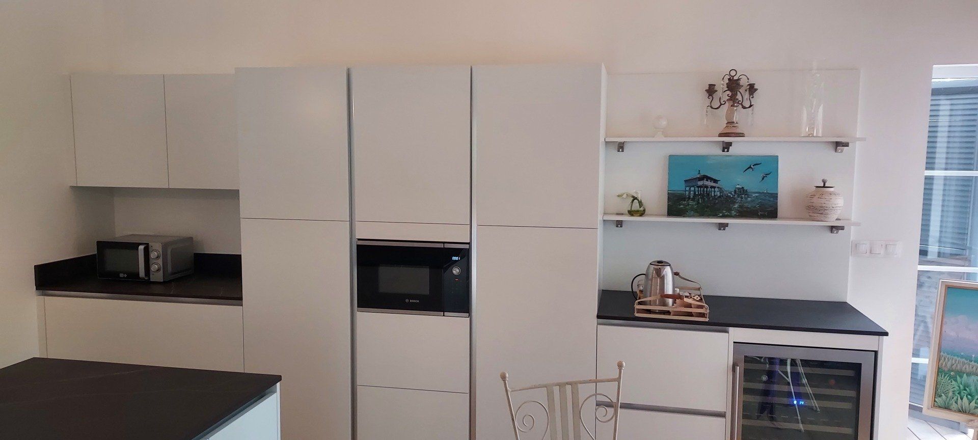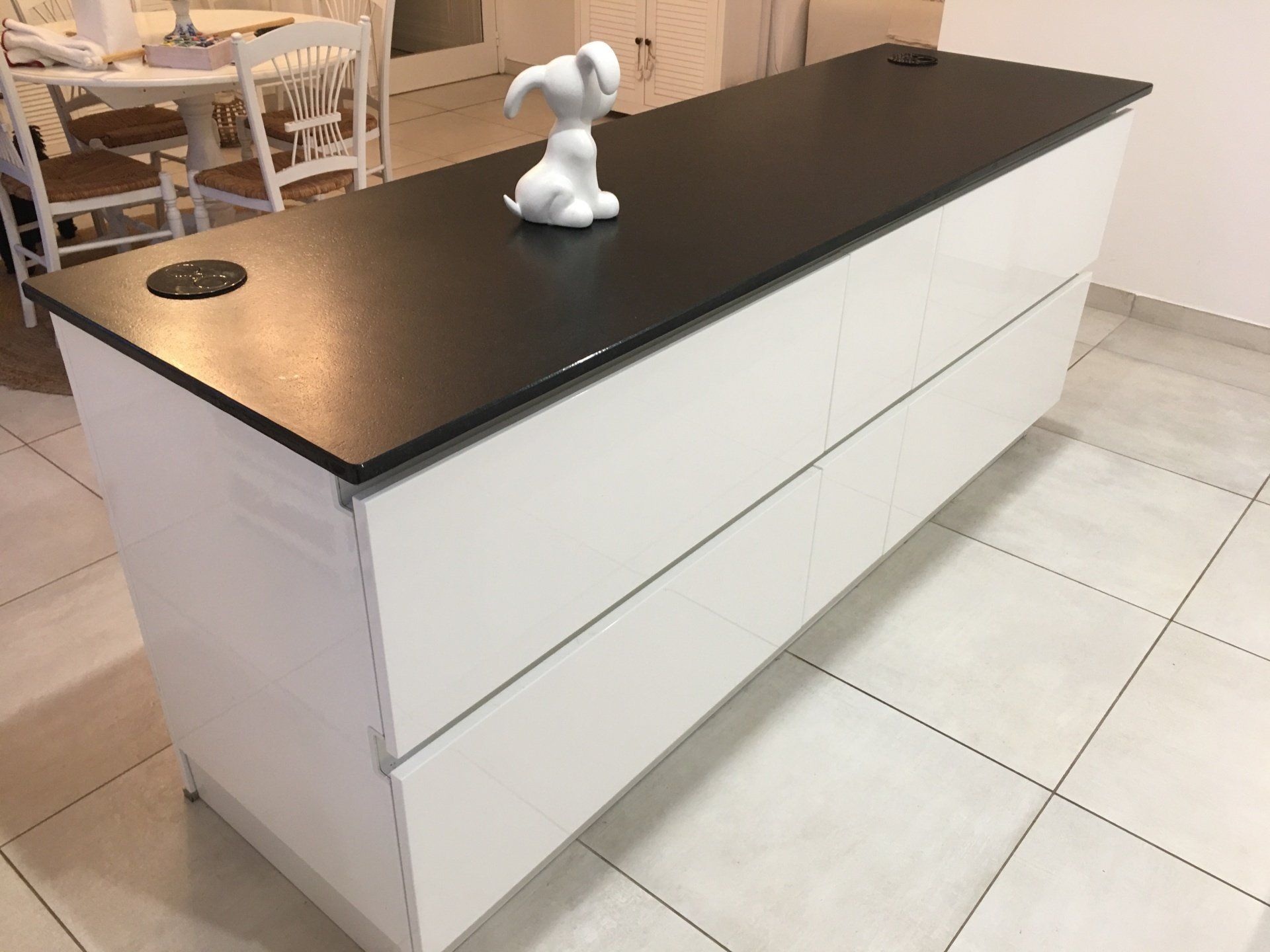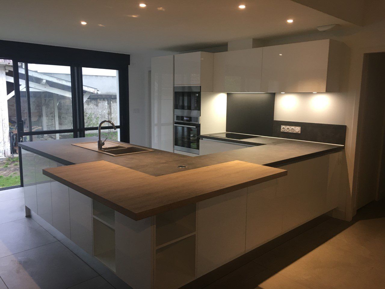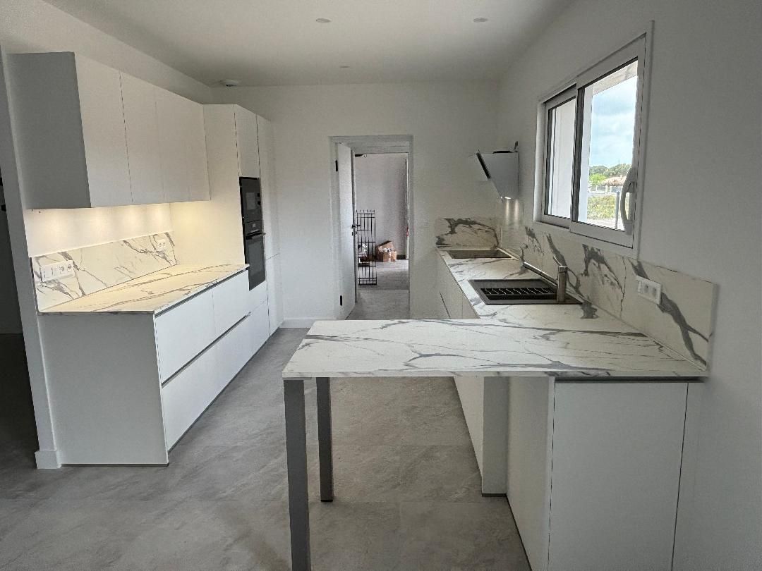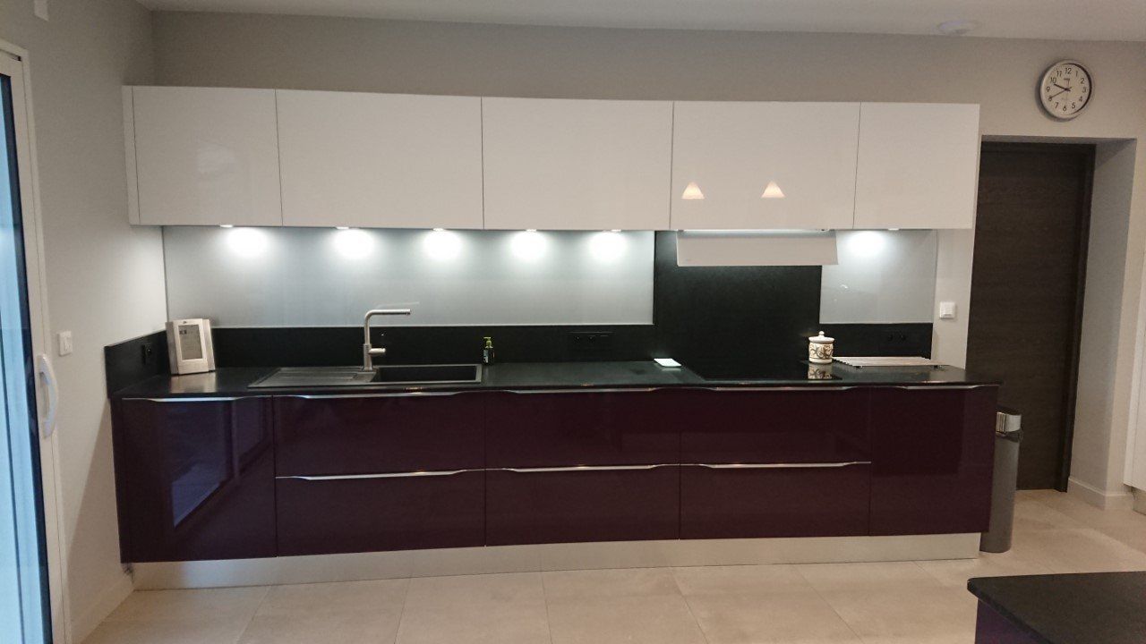 Teinte laqué blanc brillant avec plans et crédences en Dekton REM