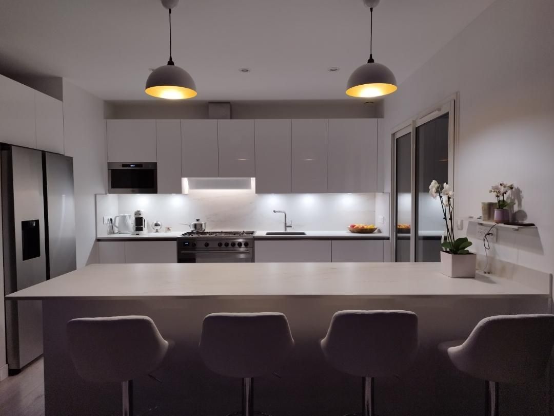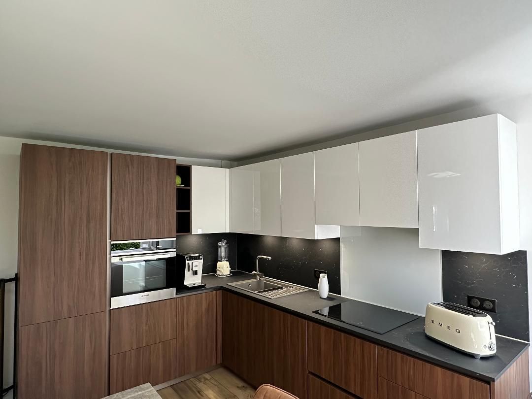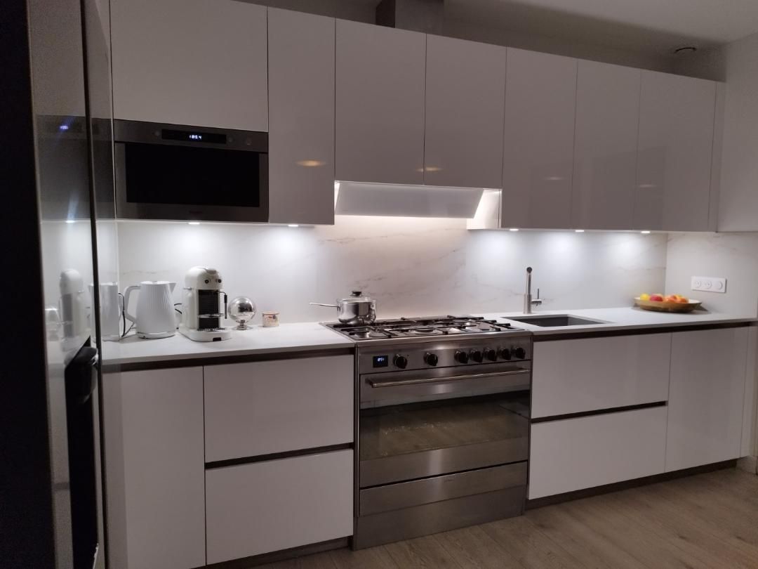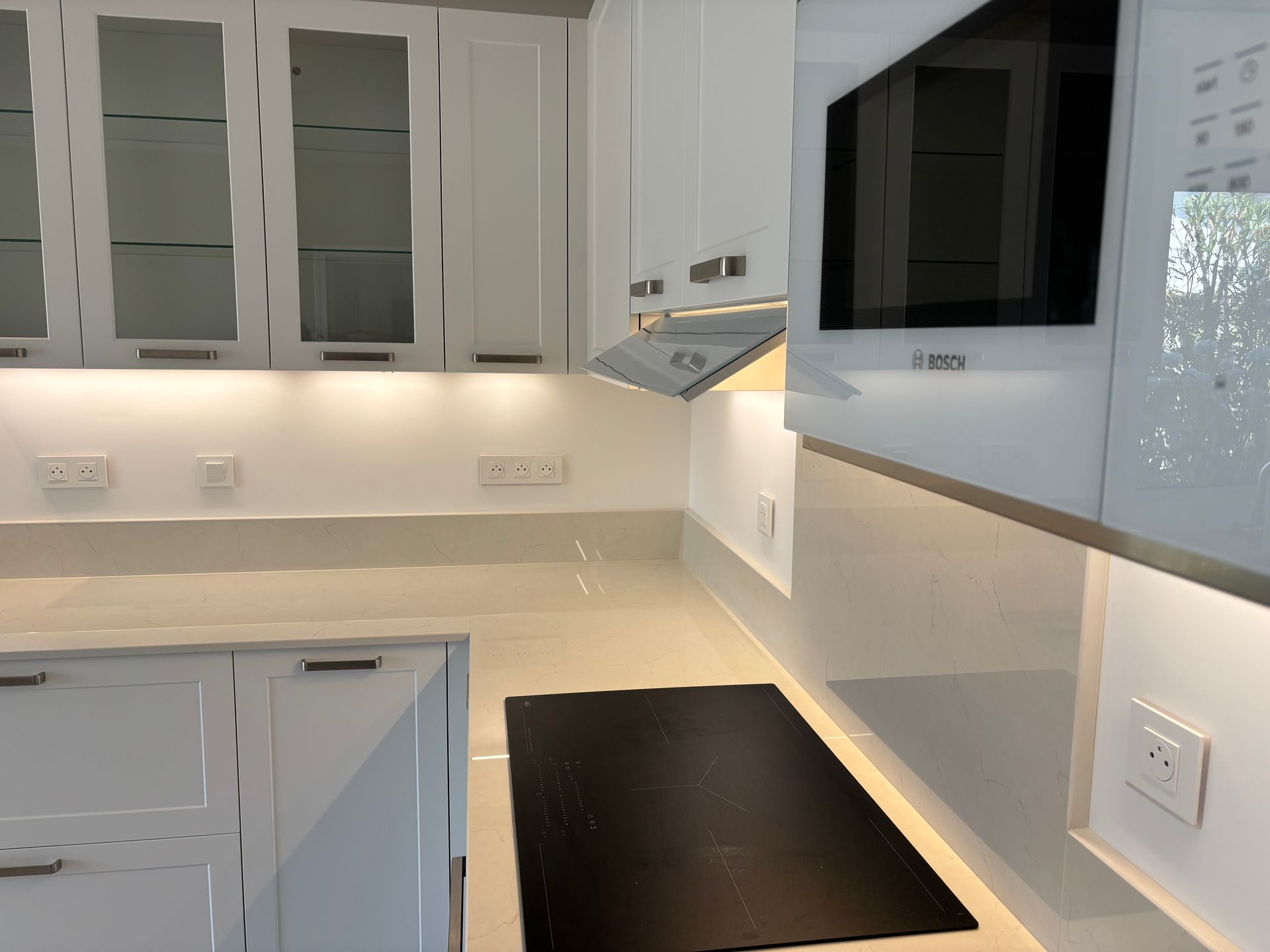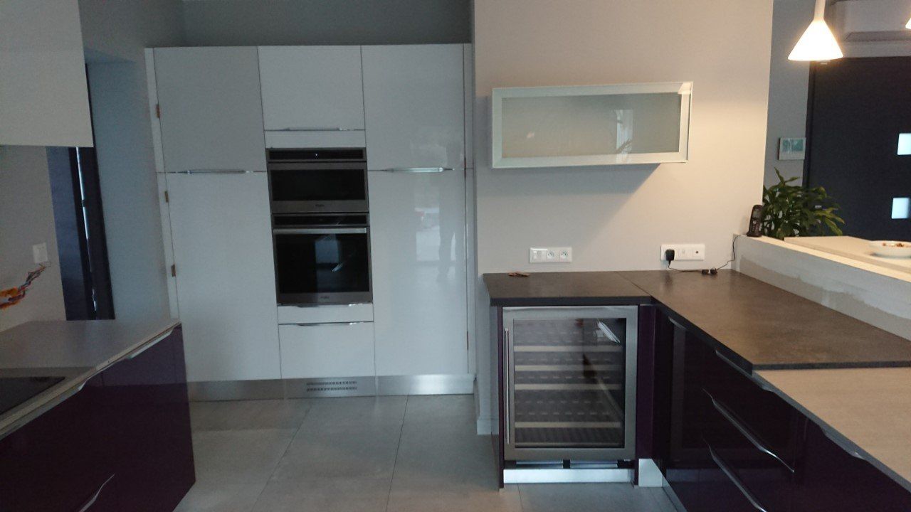 Teinte laqué blanc brillant avec plans et crédences en Dekton REM