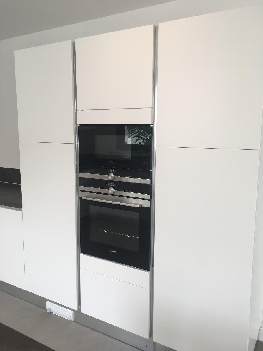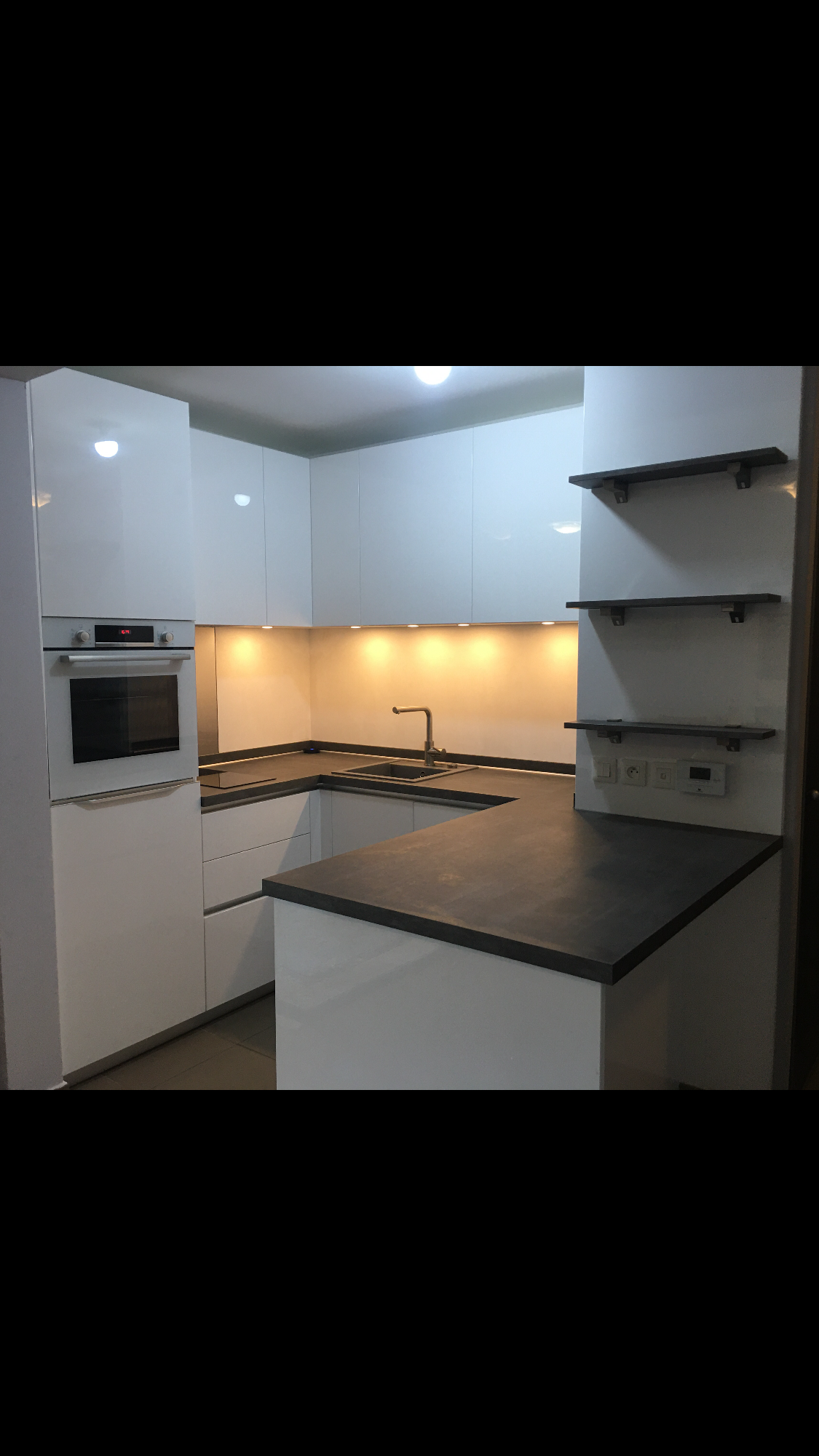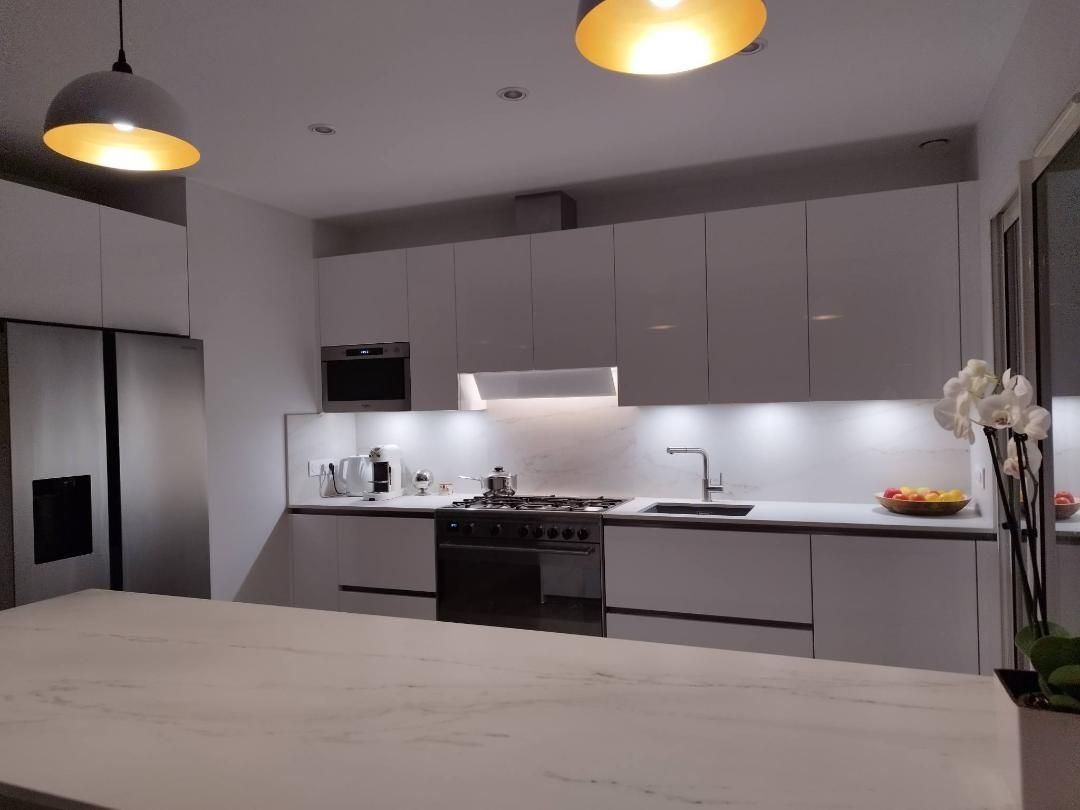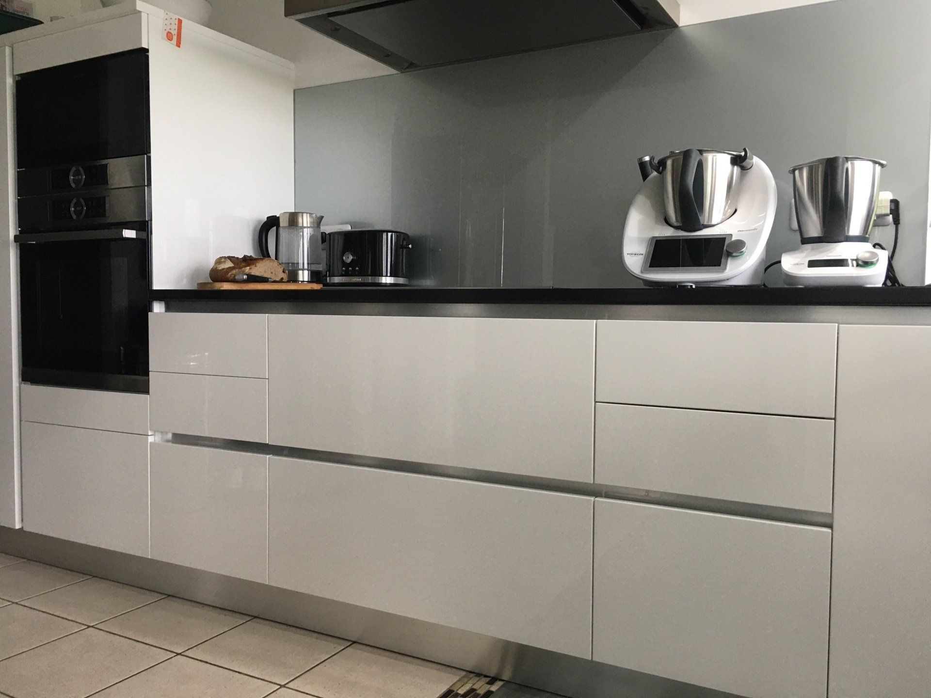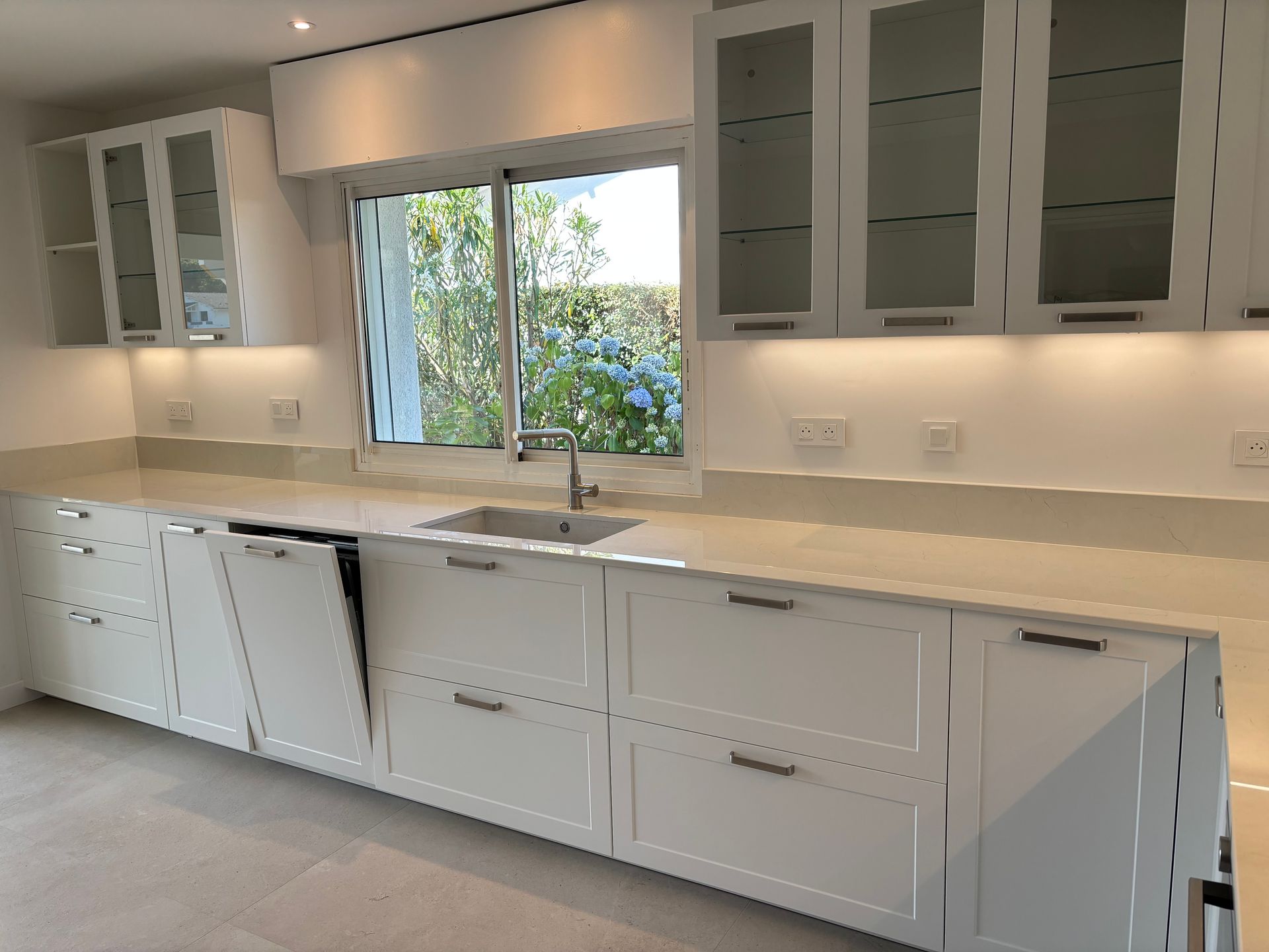 Teinte laqué blanc brillant avec plans et crédences en Dekton REM