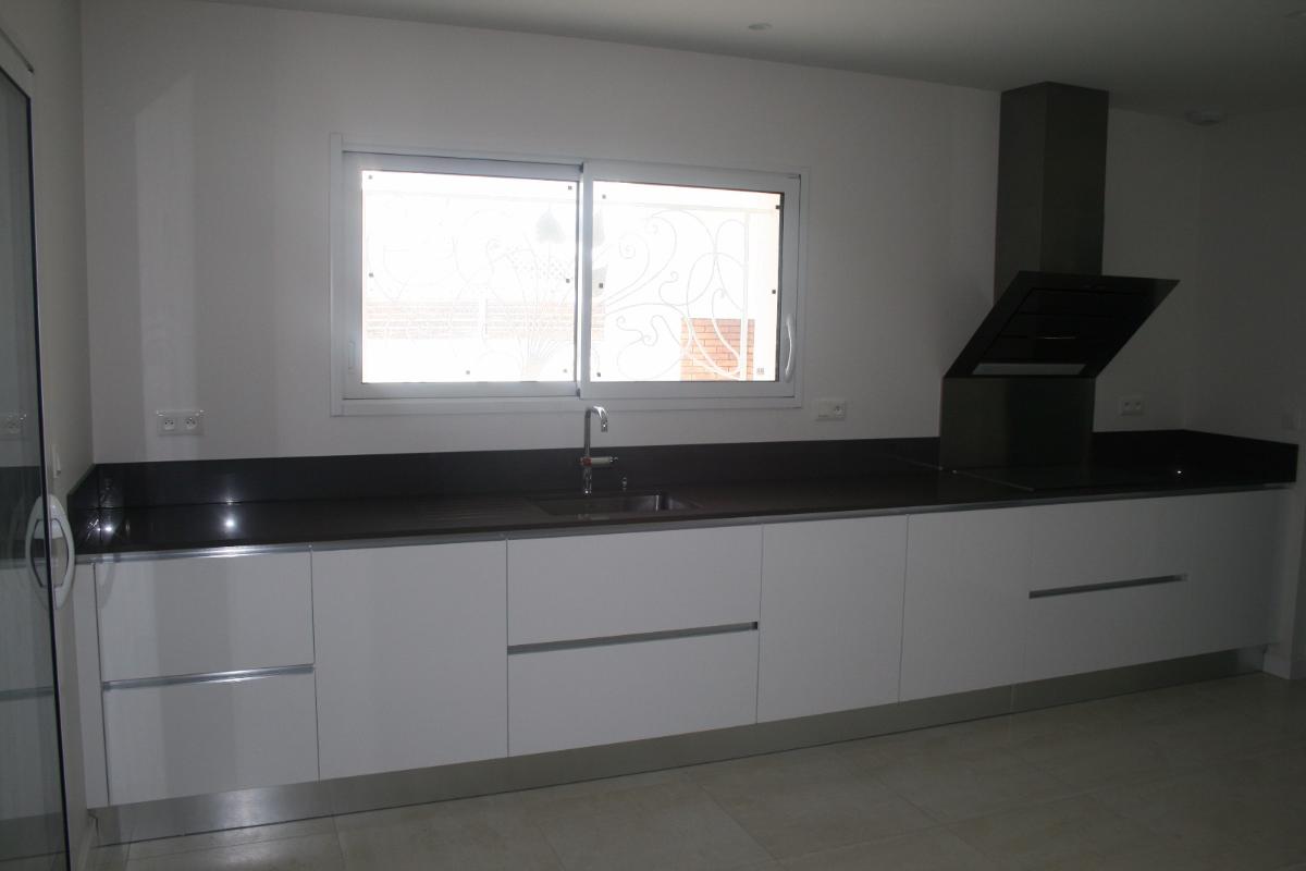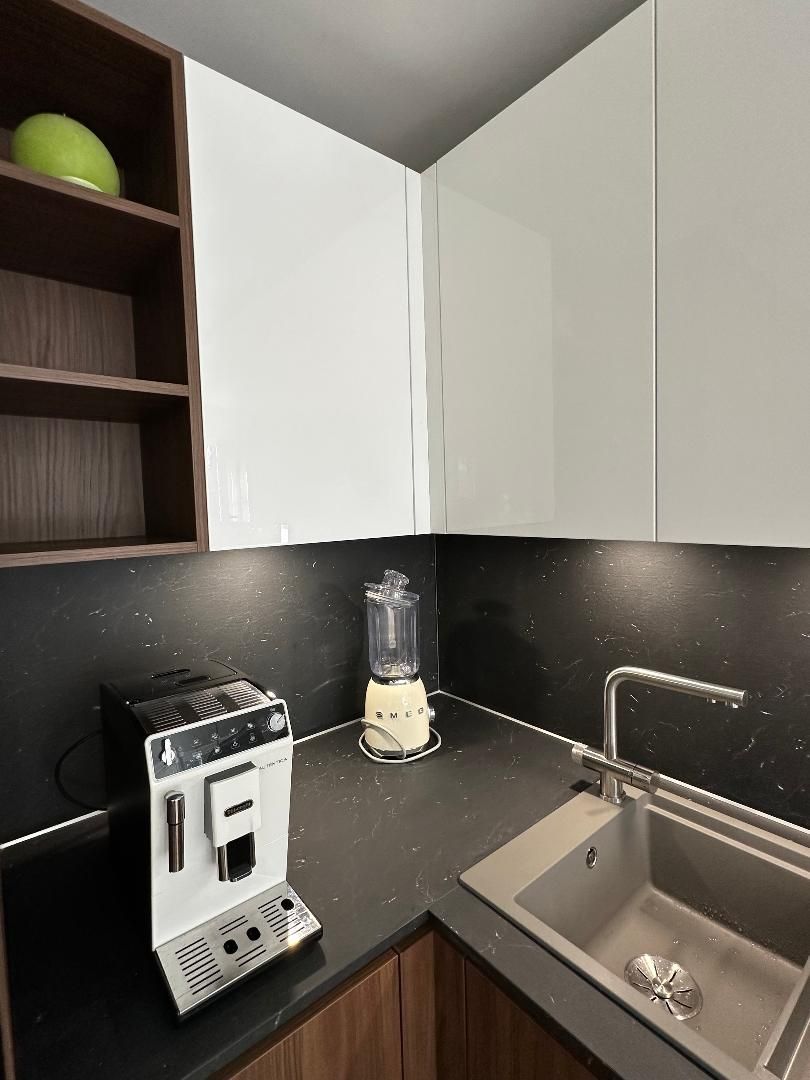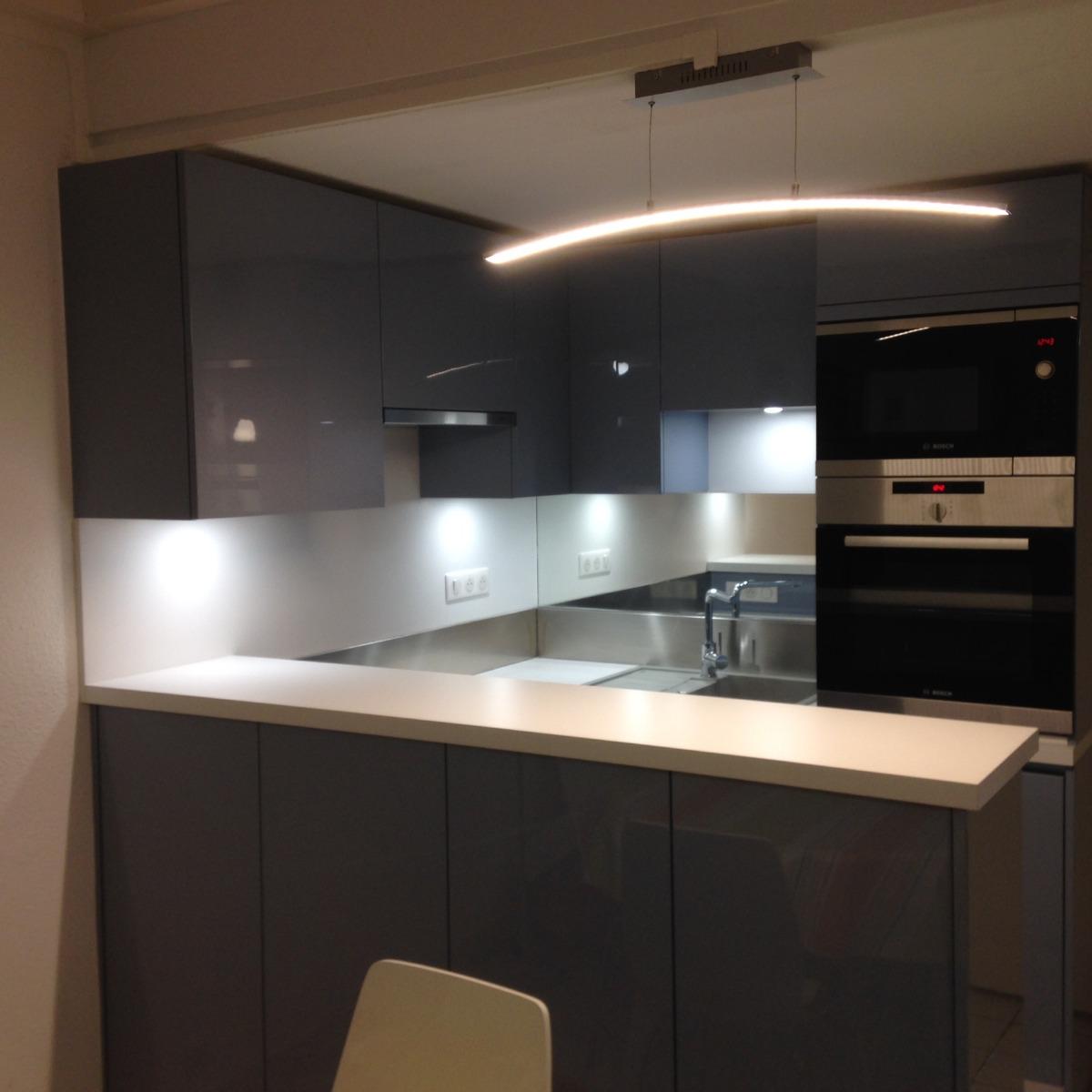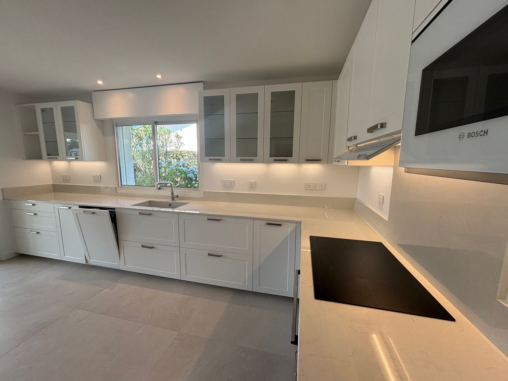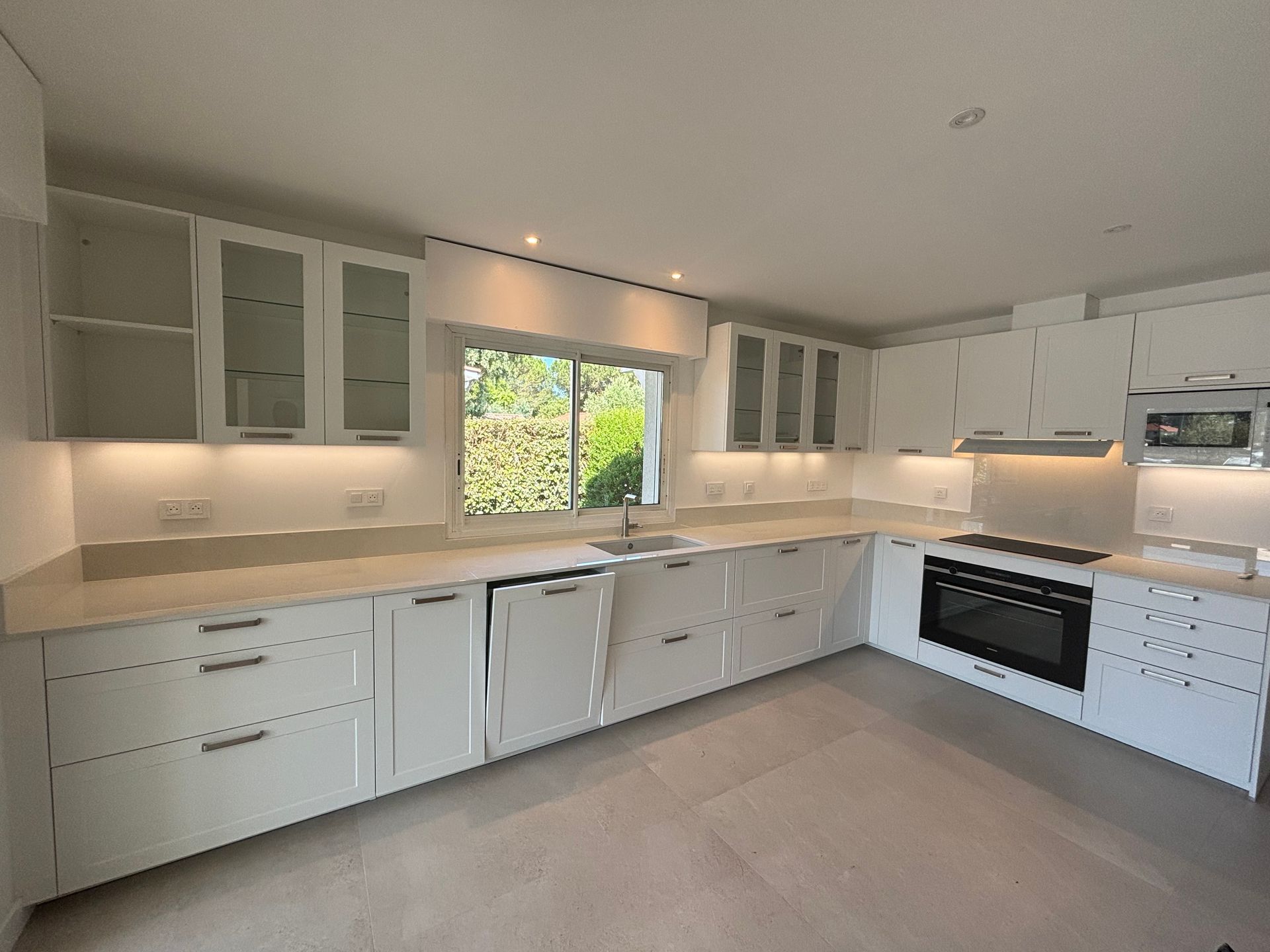 Teinte laqué blanc brillant avec plans et crédences en Dekton REM