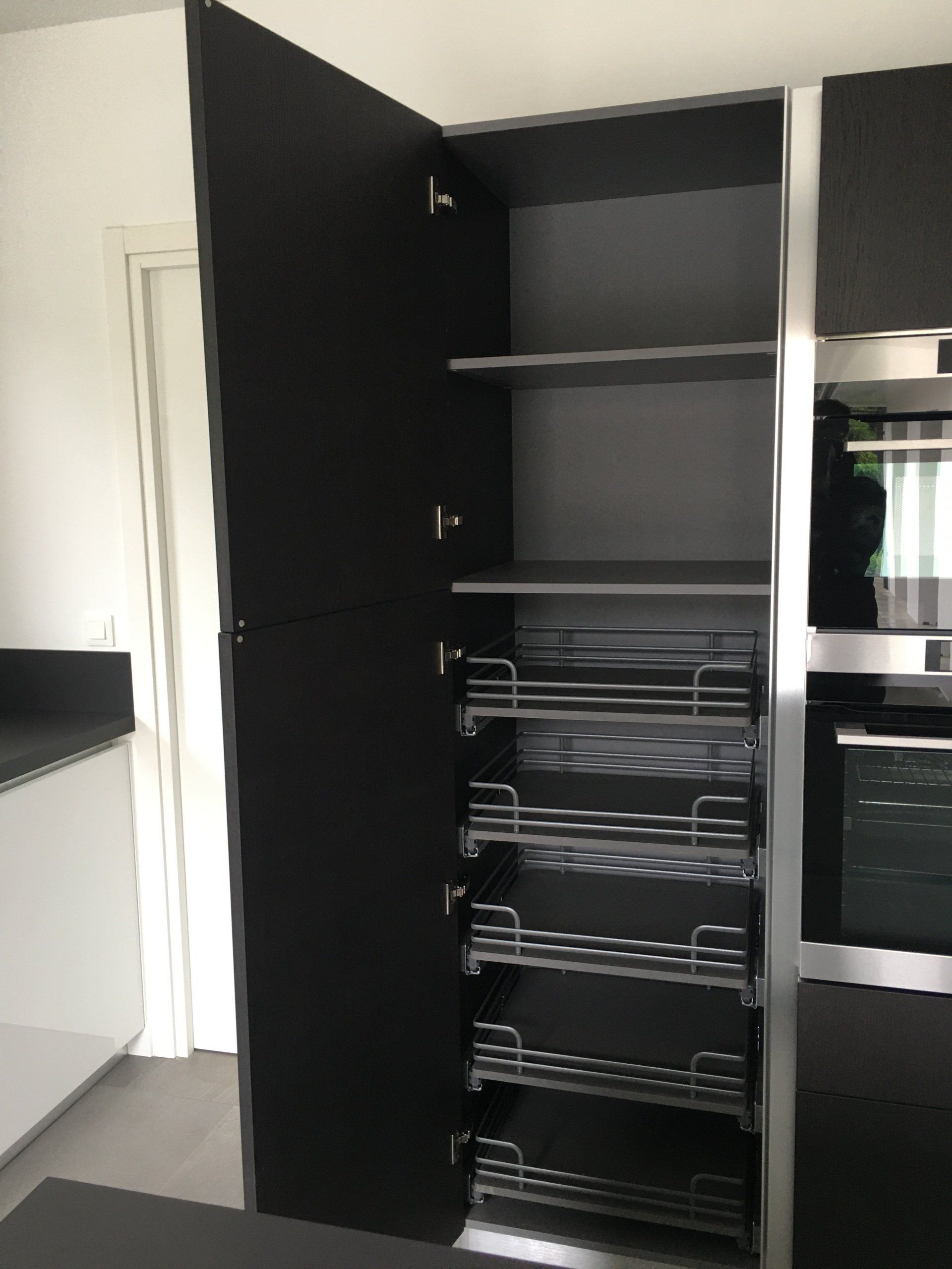 Modèle Kappa de chez Armony sans poignée en laque noire extra matt le plan de travail est en HPL stratifié Split Nature